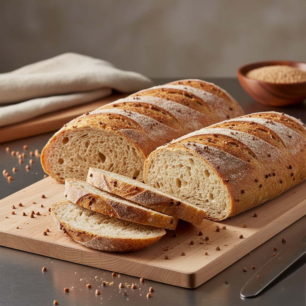 Impastare tutti gli ingredienti per 7 minuti in 1^ velocità e altri 2 minuti in 2^ velocità o comunque fino ad ottenere un impasto omogeneo. Lasciare puntare l’impasto a temperatura ambiente per 30 minuti, senza coprirlo. Spezzare l’impasto e formare delle pagnotte da 450/500 g l’una ed arrotolarle. Fare lievitare in cella a 30°C e umidità 75% per 60-90 minuti. Decorare a piacere la superficie spolverando con farina o granella di grano saraceno. Cuocere in forno statico a 180 – 200°C o in forno ventilato a 165-185°C per 50 minuti circa (di cui gli ultimi 15 con tiraggio aperto).