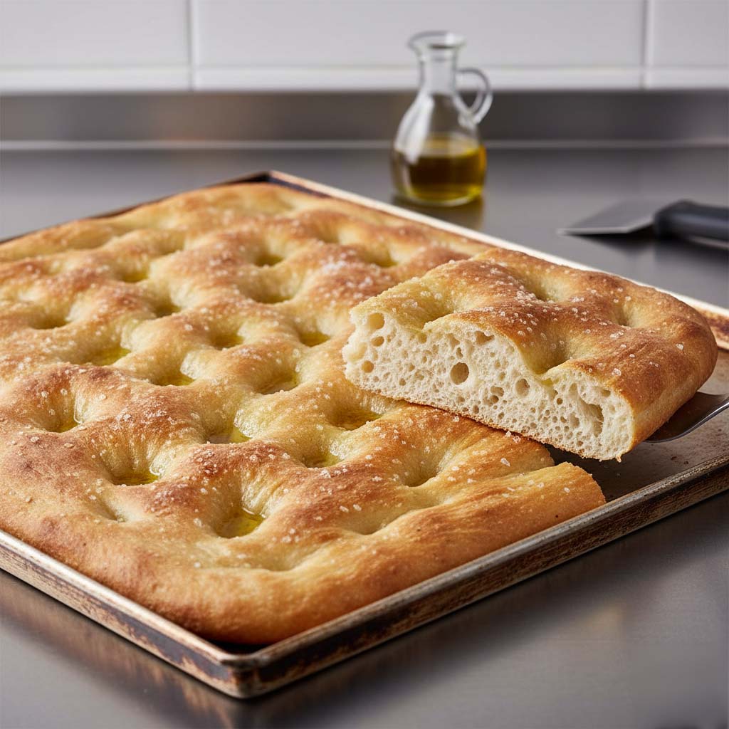 Impastare tutti gli ingredienti, tranne il lievito, per 4’ a bassa velocità, quindi aggiungere il lievito e impastare per altri 6’ ad alta velocità, fino ad ottenere un impasto uniforme. Formare pastoni da 1200 g. Far riposare a T ambiente per 20/30’, senza coprire. Stendere l’impasto su teglie 60×40 cm precedentemente unte. Guarnire a piacere, spennellare con olio e salare la superficie. Far lievitare in cella a 30°C e 75% U.R. per 60/90’. Cuocere a 210°C per 25’, dando vapore iniziale.