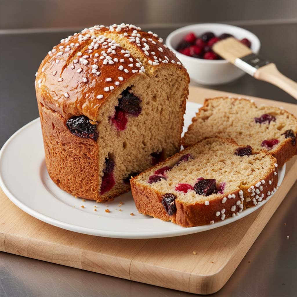 Impastare tutti gli ingredienti (ad eccezione della frutta) per 5 minuti in 1^ velocità e altri 5 in 2^ velocità. Aggiungere le prugne secche ed i frutti rossi essiccati e impastare per altri 2 minuti. Far riposare l’impasto coperto da un telo a T ambiente per 15 minuti. Spezzare e formare delle pagnottelle da 230 g l’una e porle negli appositi stampi. Far lievitare in cella a 30°C e umidità 75% per 60 – 80 minuti. Spennellare la superficie con uovo e decorarla con zucchero in granella o a velo. Incidere a piacere la superficie e cuocere in forno statico a 180°C o in forno ventilato a 160°C per 25 minuti.