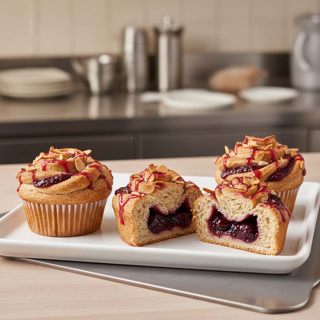 Introdurre tutti gli ingredienti in impastatrice e lavorare sino ad ottenere una massa liscia ed elastica. Stendere la massa ottenuta ad uno spessore di 2-3 cm e disporre su una teglia avvolta in un foglio di nylon. Ritirare in frigorifero per 10-12 ore a 0 – 4°C. Stendere in sfogliatrice ad uno spessore di 3 mm e spalmare con confettura di cliegia. Arrotolare e tagliare. Disporre in stampi di carta tipo muffin e porre a lievitare per 60′ a 30-32°C umidità 70%. Cospargere di mandorle affettate e cuocere a 160°C in forno ventilato per 15 minuti circa. Appena sfornato decorare con ghiaccia all’acqua (acqua 25 g – zucchero a velo 100 g) con colorante rosso.